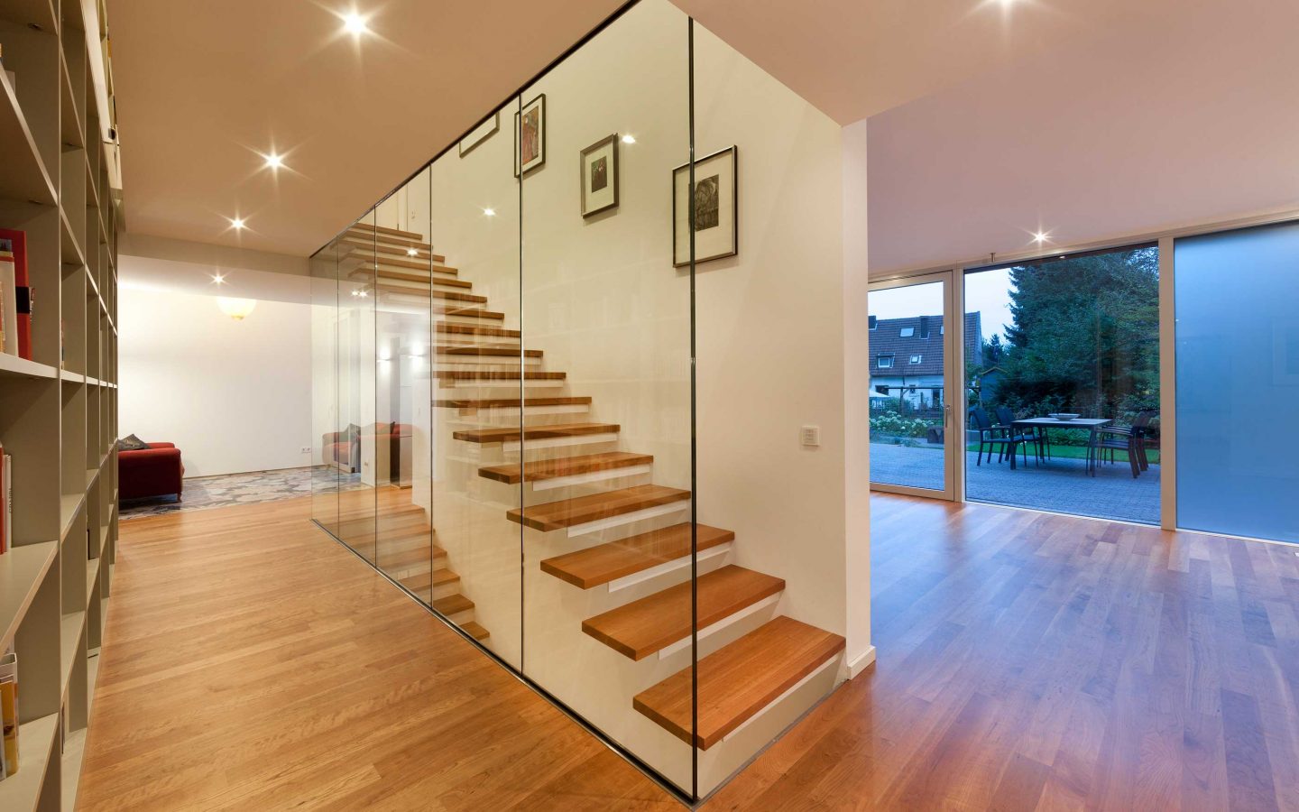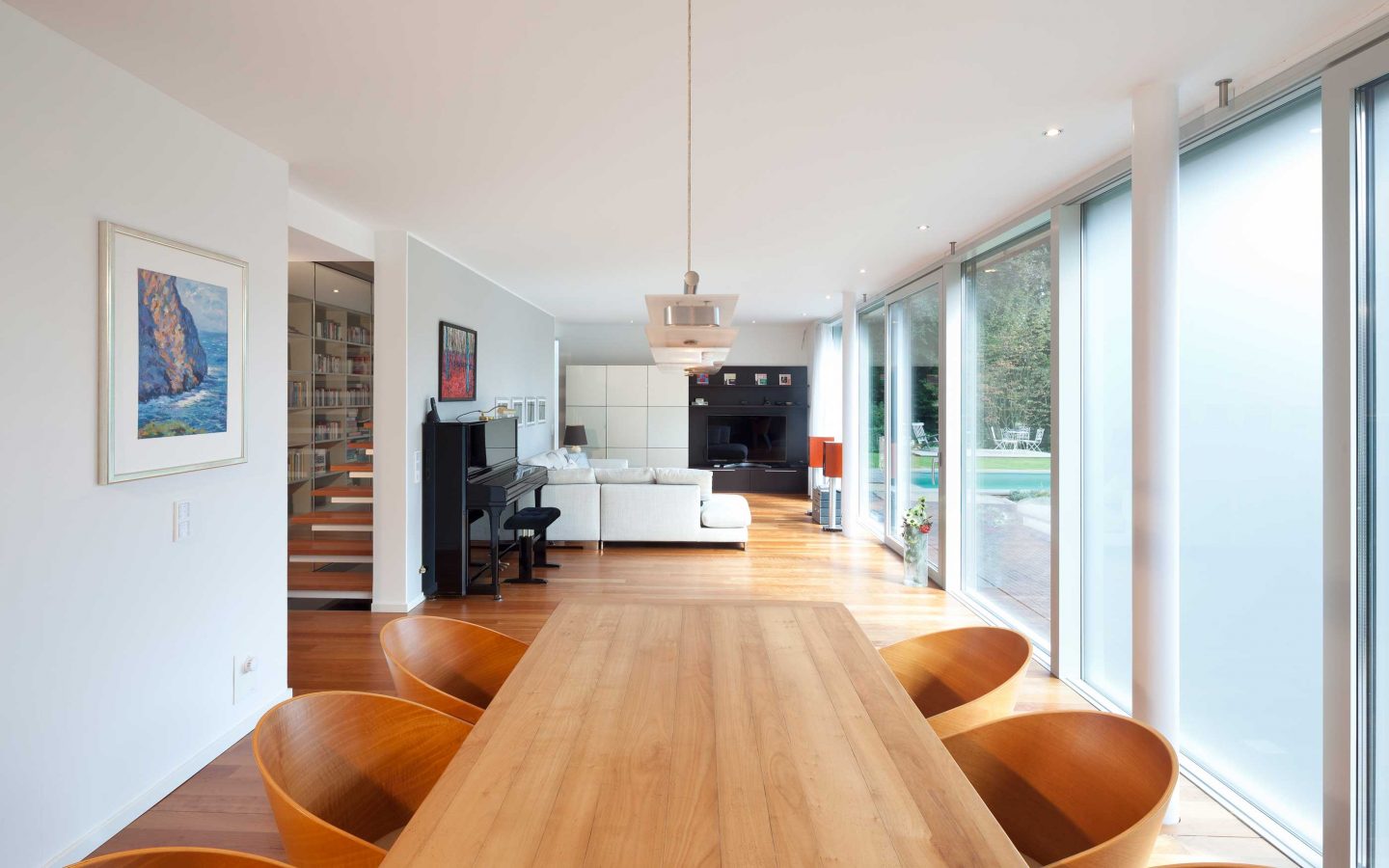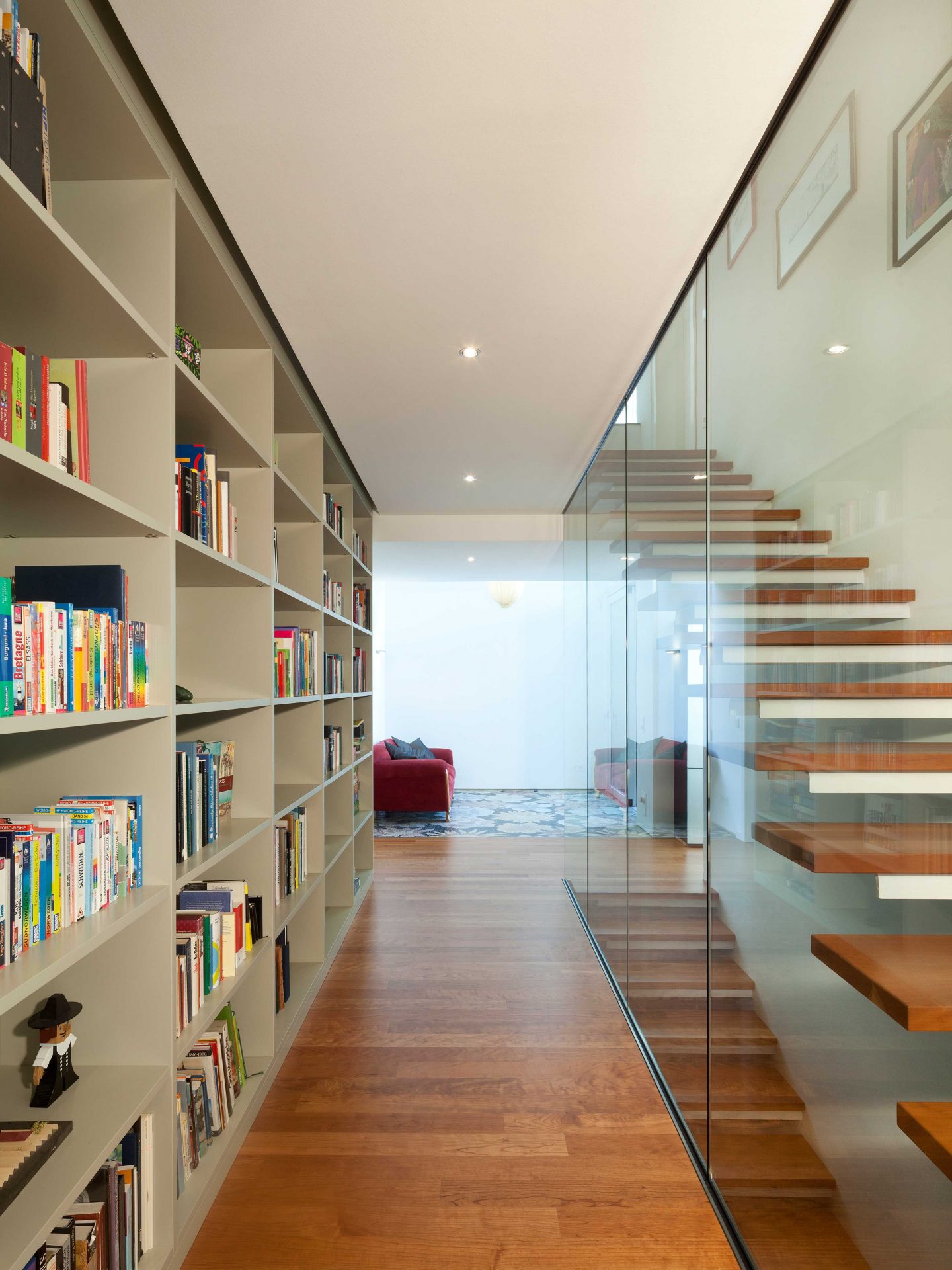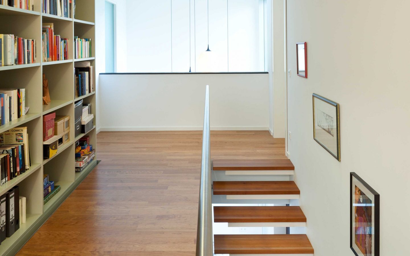 Die knappe Erschliessung des Grundstücks über Eck, sowie die Bibliothek der Bauherrn als Mittelpunkt des privaten, intellektuellen Lebens, geben dem Konzept Inhalt und Struktur.Der zentrale geschossübergreifende Treppenraum wird seitlich, in einem extrem schmalen, aber die Geschosse offen verbindenden Luftraum von der Bibliothekswand der Hausherrin begleitet und gibt dem Haus im Inneren Inhalt und Seele. Die Zugangssituation ergibt sich selbstverständlich durch den quadratischen Ausschnitt der Gebäudeecke. Der quadratische Ausschnitt als Zugangsbereich findet seine strukturelle Entsprechung diagonal gegenüber auf der Hausseite zum Garten. Hier ist ein windgeschützter Lesebereich im Freien. Der offenen Durchwegung des Hauses, vom Zugang über Eschliessungsraum und Leseort in den Garten, sind zum Garten der offene Wohnbereich mit Küche und Essplatz angeordnet. Auf der Nordseite ist der Arbeitsbereich mit eigenem Bad vorgesehen, optional nutzbar als behindertengerechter Pflegebereich im Sinne des Mehrgenerationenwohnens.