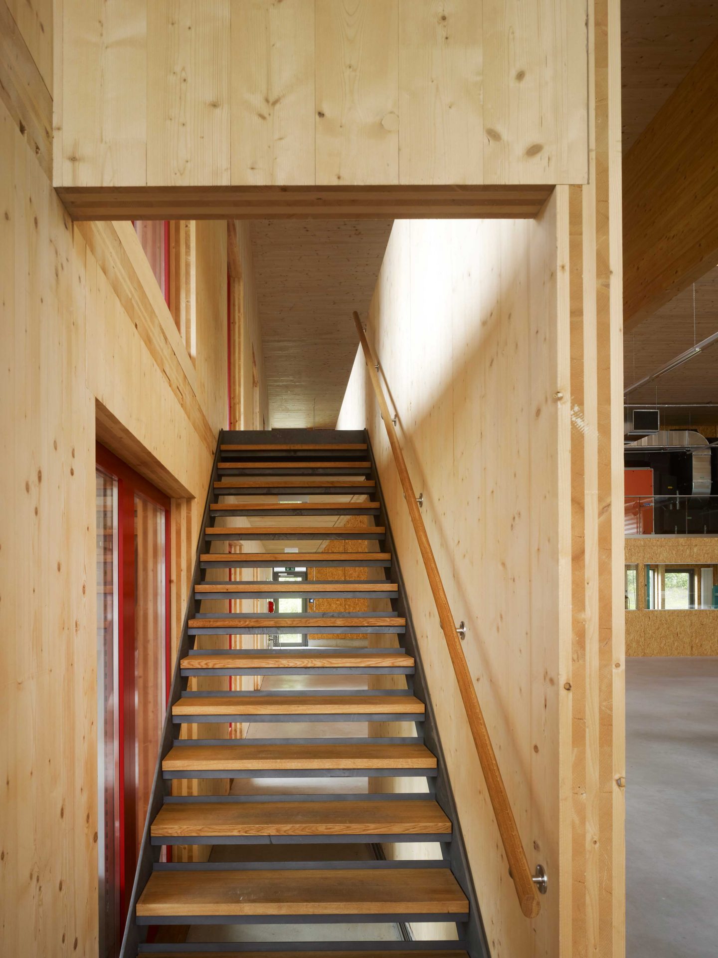 Um ein ganzheitlich ökologisches sowie effizientes Gebäude zu konzipieren wurde die Halle neben ihrer Auslegung als Nullenergiegebäude auch im Hinblick auf die verwendeten Materialien und das Nutzerempfinden sorgfältig geplant. Zentraler Punkt des Entwurfs ist die hochgedämmte Holz-Leichtbaukonstruktion, die sich in der langjährigen Erfahrung der Architekten bewährt hat. Die Verwendung von Holz im Sichtbereich führt die Materialwahl im Innenraum konsequent fort und erzeugt ein freundliches Umfeld. Überlegt gesetzte Öffnungen schaffen fließende Übergänge und Akzente in der weitläufigen Halle.