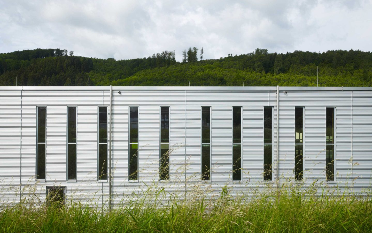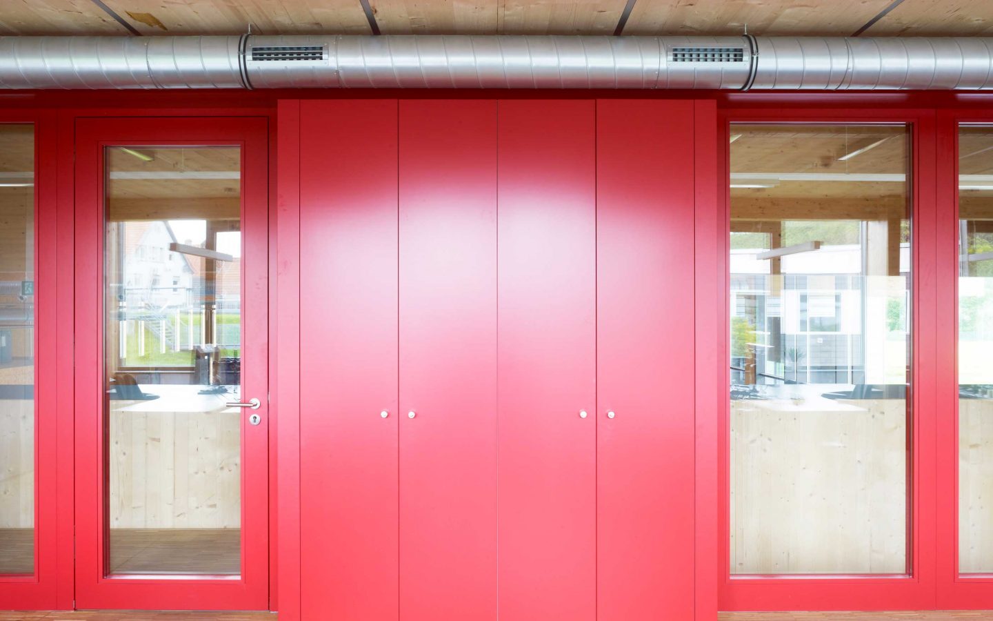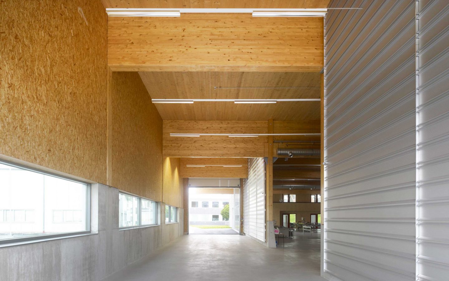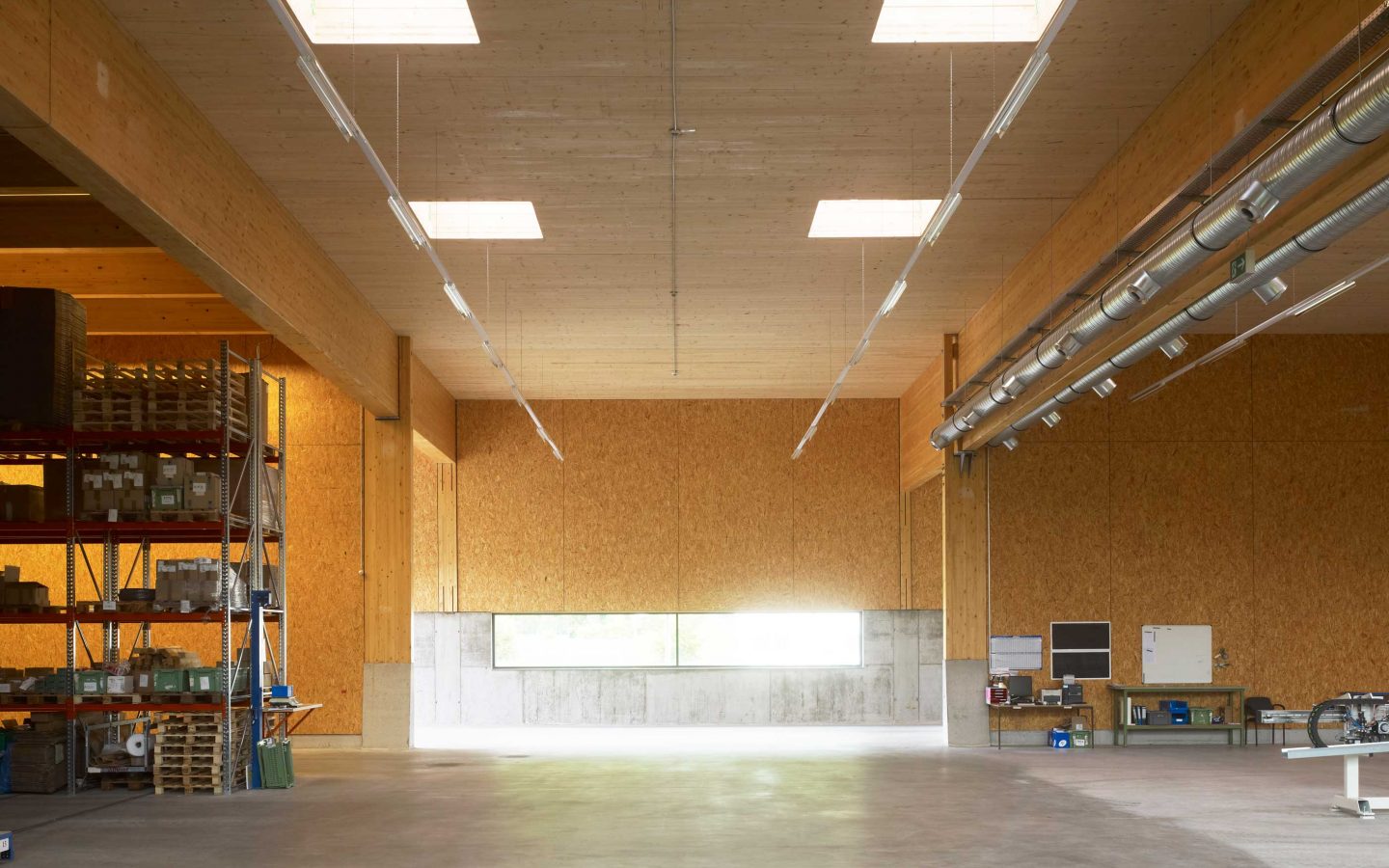 Um ein ganzheitlich ökologisches sowie effizientes Gebäude zu konzipieren wurde die Halle neben ihrer Auslegung als Nullenergiegebäude auch im Hinblick auf die verwendeten Materialien und das Nutzerempfinden sorgfältig geplant. Zentraler Punkt des Entwurfs ist die hochgedämmte Holz-Leichtbaukonstruktion, die sich in der langjährigen Erfahrung der Architekten bewährt hat. Die Verwendung von Holz im Sichtbereich führt die Materialwahl im Innenraum konsequent fort und erzeugt ein freundliches Umfeld. Überlegt gesetzte Öffnungen schaffen fließende Übergänge und Akzente in der weitläufigen Halle.