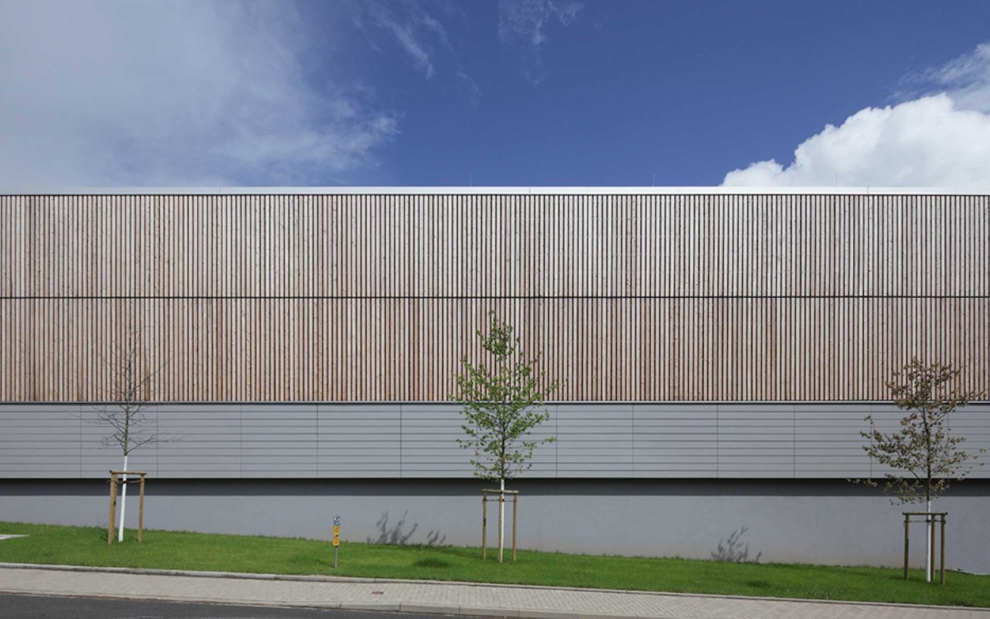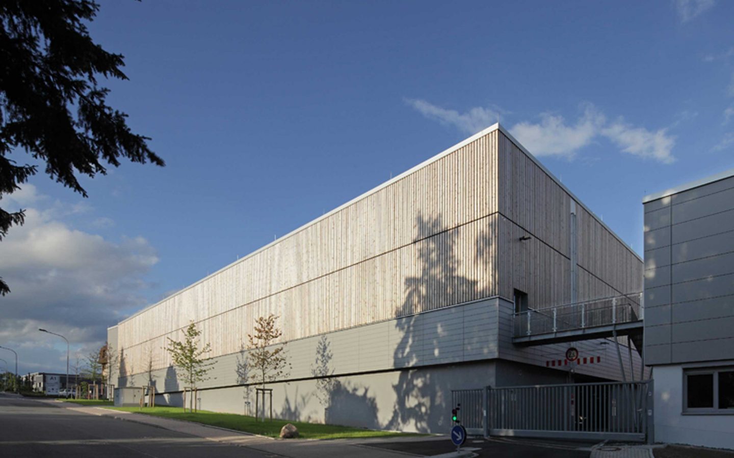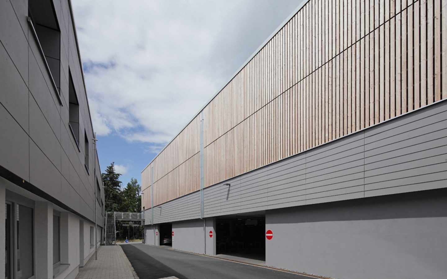 Für den 25 Kilometer von Bielefeld entfernt gelegenen Hauptsitz der Hettich Unternehmensgruppe in Kirchlengern realisierten Banz + Riecks Architekten die zweigeschossige Erweiterung einer Fertigungshalle in Kombination mit einer Parkgarage. Um den Wunsch des Bauherrn nach einem modernen sowie energieeffizienten Gebäude auf ökonomisch sinnvolle Weise zu verwirklichen, entwickelten die Architekten eine Mischkonstruktion aus Beton, Stahl und Holzrahmenbau. Diese lässt sich teilweise außen an der Hülle ablesen und verleiht der Fassade eine differenzierte Erscheinung.