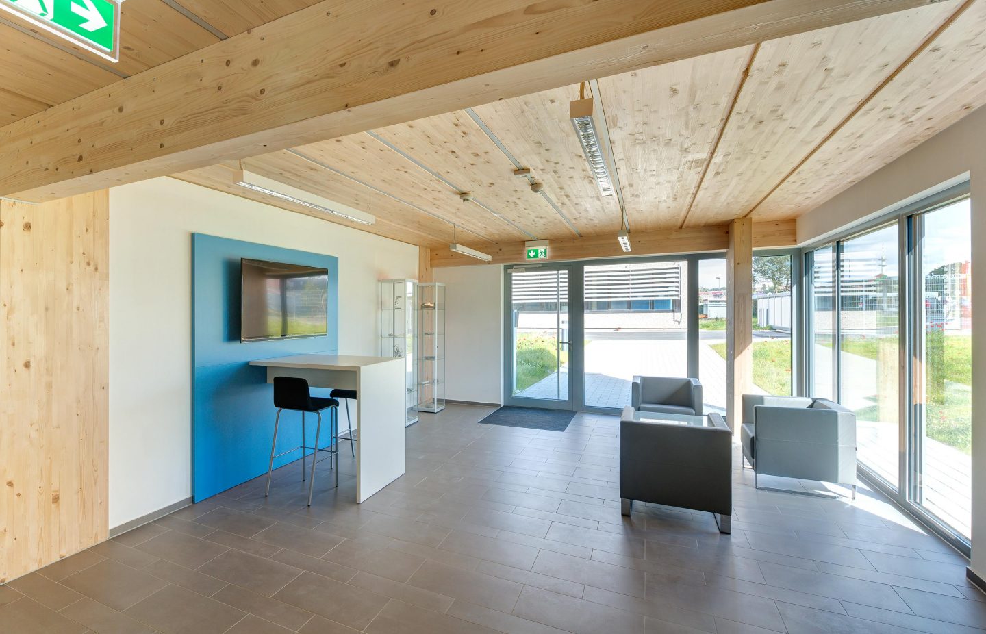 Den hohen Brandschutzanforderungen Rechnung tragend sind die Wände im Herstellungsbereich aus Stahlbeton konstruiert. Lediglich für die Durchfahrten zur vorgesehenen Erweiterung sowie Wände von optional zu öffnenden Technikbereiche sind aus Kalksandsteinmauerwerk ausgeführt. Der Büro- und Besprechungstrakt ist sowohl konstruktiv als auch farblich gegenüber der Haupthalle differenziert ausgeführt. Im Gegensatz zur Stahl- und Stahlbetonkonstruktion der Produktion ist die Tragstruktur hier gänzlich aus Holz konstruiert.