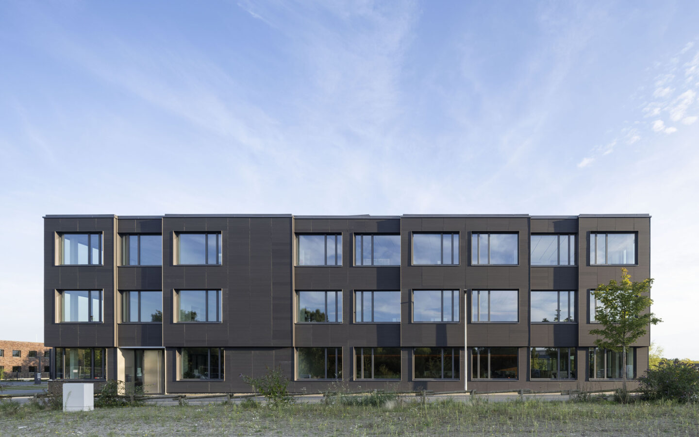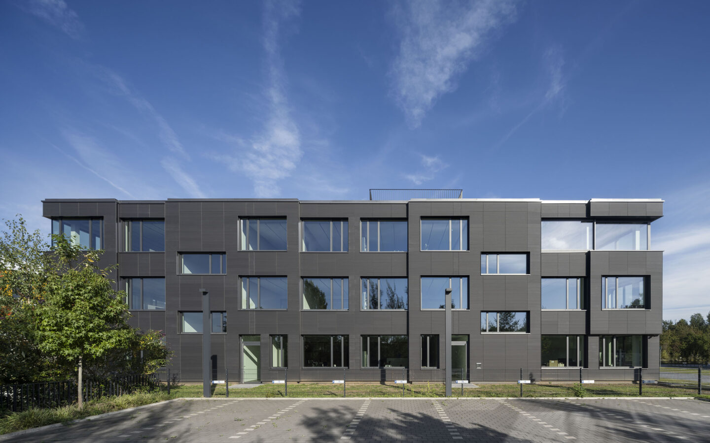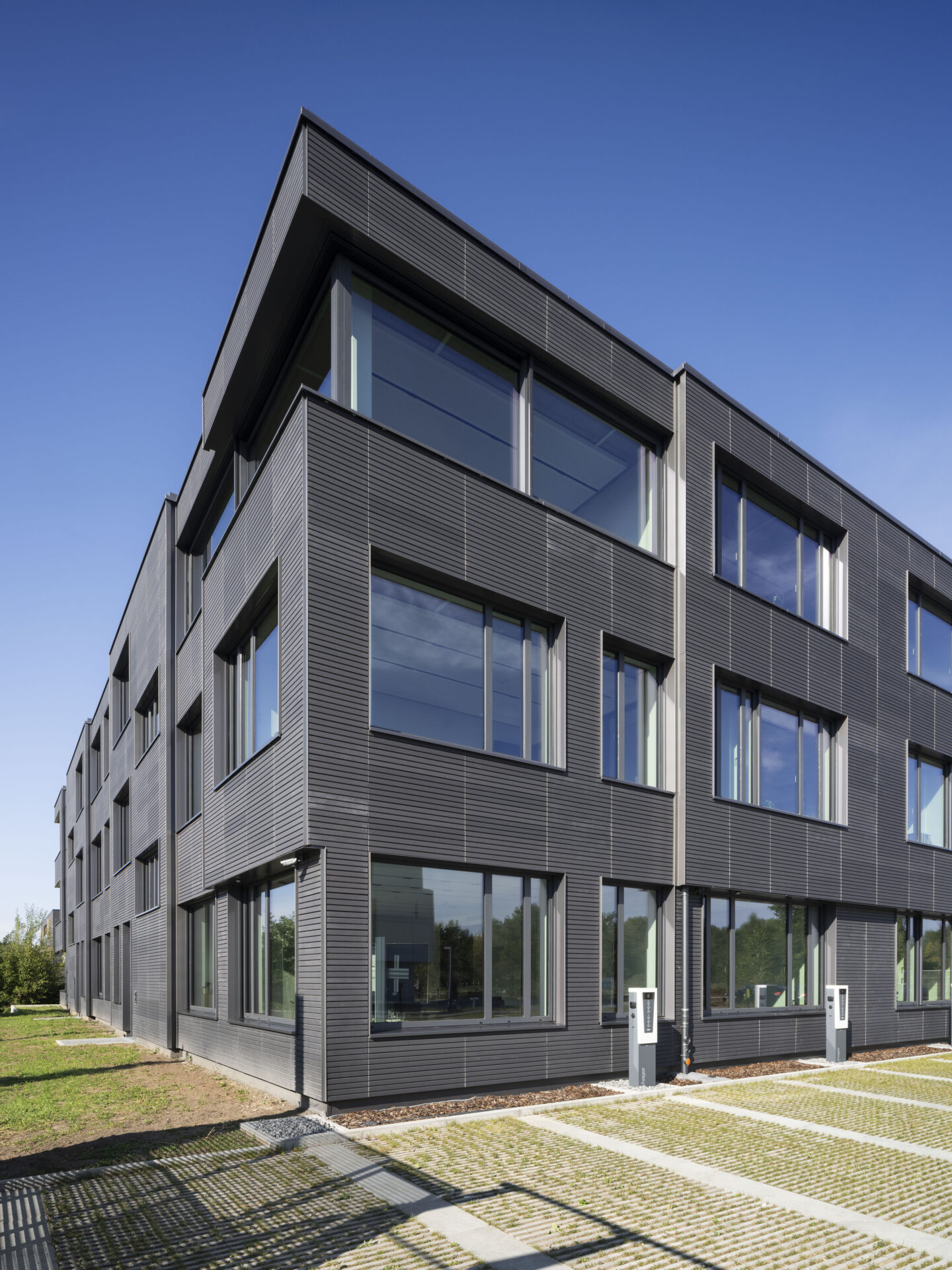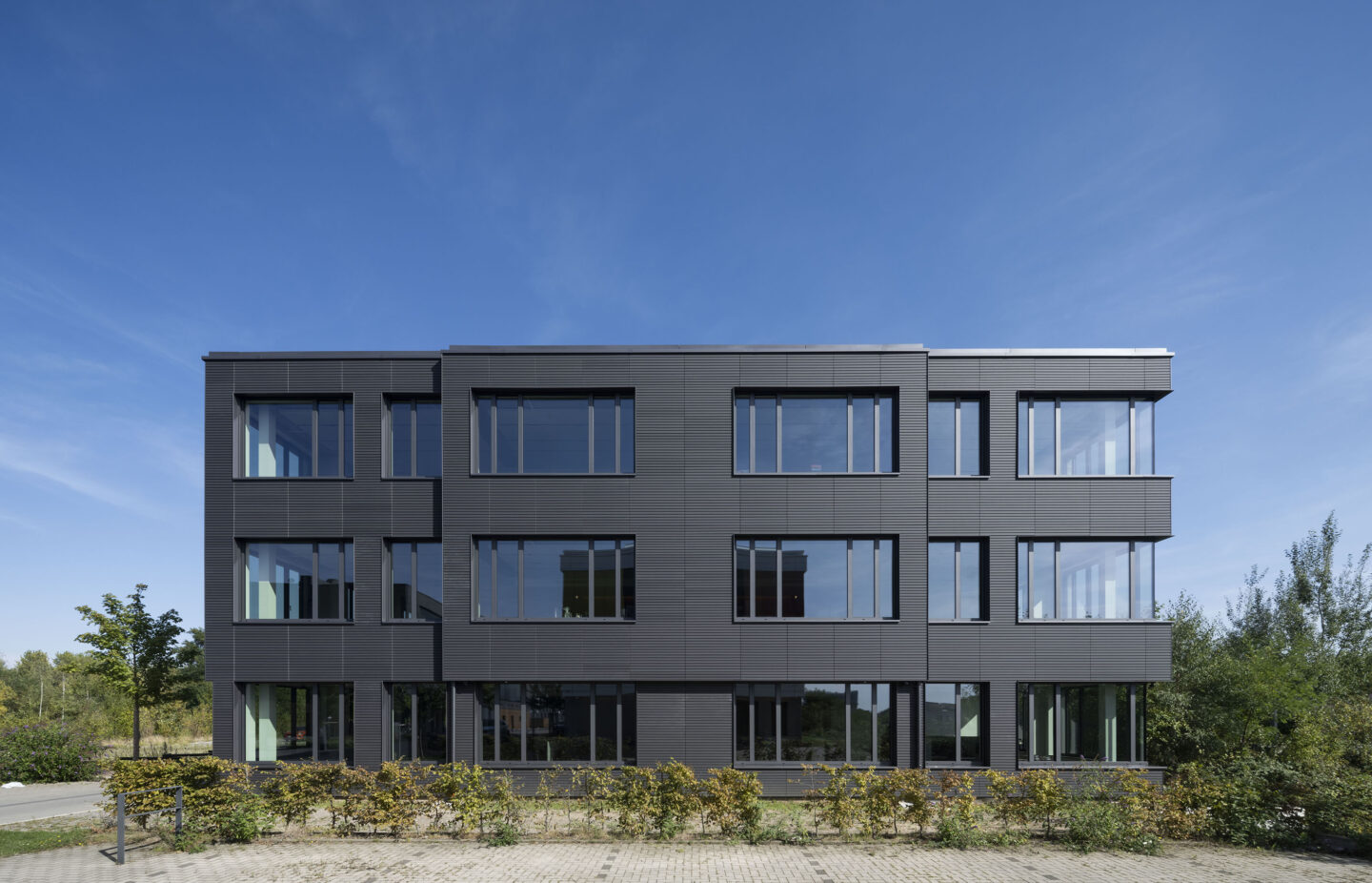Verglasungen sind als Dreifachglas mit Wärmeschutzfunktionalität sowie, nach spezifischer Anforderung, mit Sonnenschutzfunktionalität vorgesehen. Die Optimierung des Wärmeschutzes im Winter als auch die Reduktion der Wärmeeinstrahlung im Sommer erreicht den energetisch optimierten Betrieb, die auf dem Dach installierte Photovoltaikanlage erreicht eine weitgehende Primärenergiebedarfsdeckung. Über Luft Wasserwärmepumpen wird der Wärmebedarf im Winter gedeckt, das Gebäude ergänzend im Sommer regenerativ entwärmt, um die notwendigen Rauminnenklimawerte zu erreichen. Der Gesamtenergiebedarf liegt um rund 60 % unter dem Anfor-derungswert des relevanten BEG Referenzgebäudes.