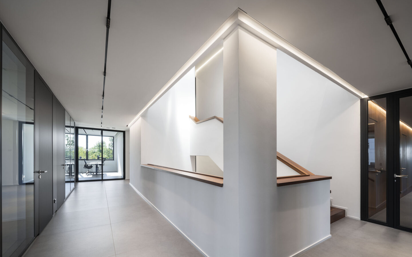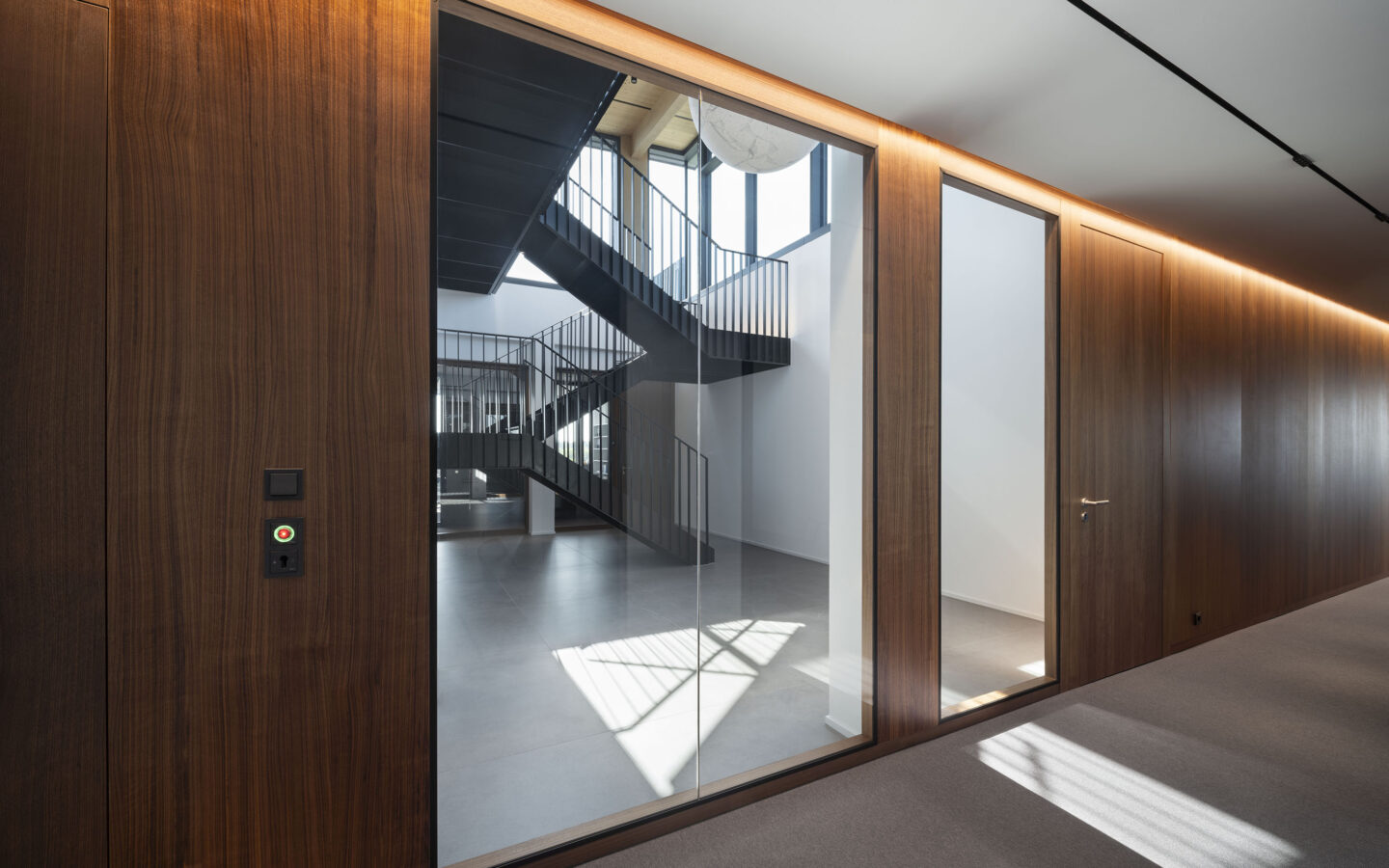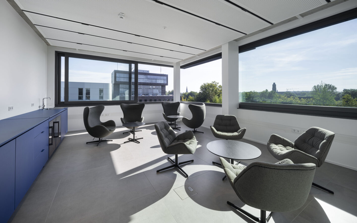 Verglasungen sind als Dreifachglas mit Wärmeschutzfunktionalität sowie, nach spezifischer Anforderung, mit Sonnenschutzfunktionalität vorgesehen. Die Optimierung des Wärmeschutzes im Winter als auch die Reduktion der Wärmeeinstrahlung im Sommer erreicht den energetisch optimierten Betrieb, die auf dem Dach installierte Photovoltaikanlage erreicht eine weitgehende Primärenergiebedarfsdeckung. Über Luft Wasserwärmepumpen wird der Wärmebedarf im Winter gedeckt, das Gebäude ergänzend im Sommer regenerativ entwärmt, um die notwendigen Rauminnenklimawerte zu erreichen. Der Gesamtenergiebedarf liegt um rund 60 % unter dem Anfor-derungswert des relevanten BEG Referenzgebäudes.