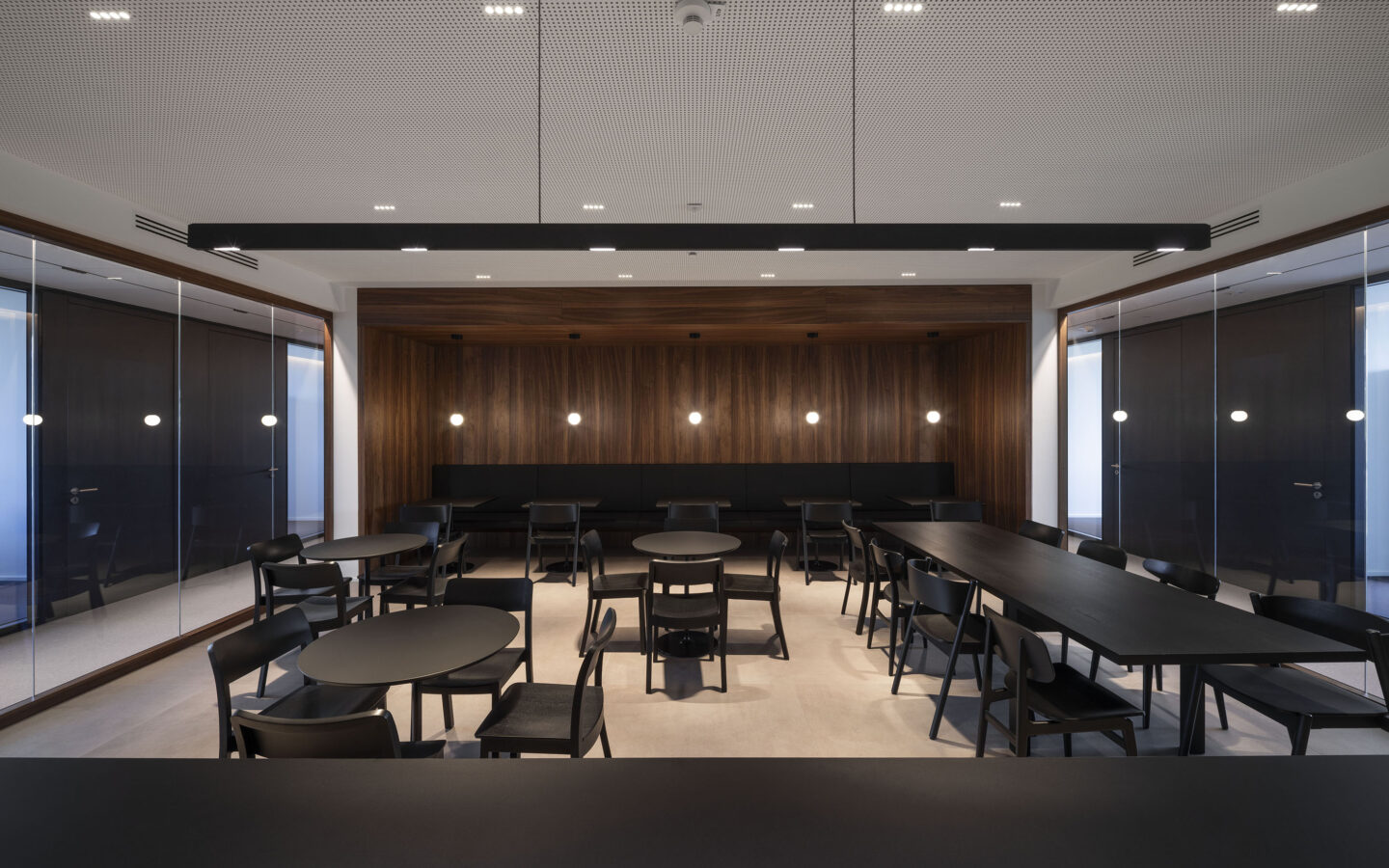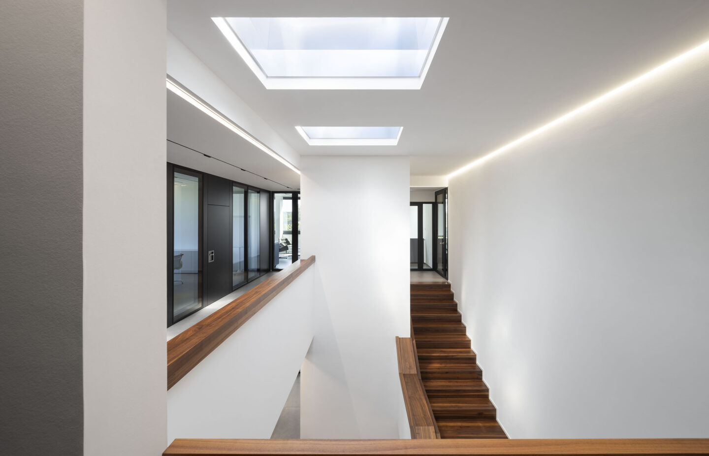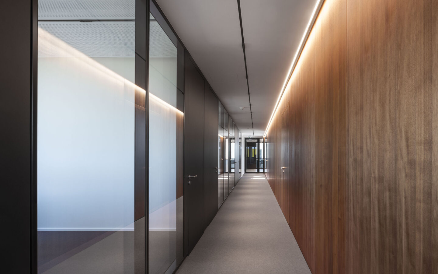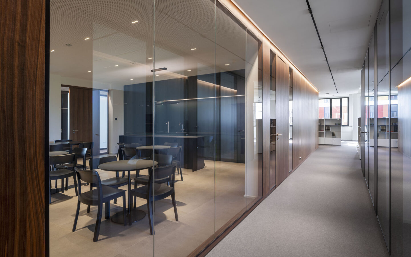Verglasungen sind als Dreifachglas mit Wärmeschutzfunktionalität sowie, nach spezifischer Anforderung, mit Sonnenschutzfunktionalität vorgesehen. Die Optimierung des Wärmeschutzes im Winter als auch die Reduktion der Wärmeeinstrahlung im Sommer erreicht den energetisch optimierten Betrieb, die auf dem Dach installierte Photovoltaikanlage erreicht eine weitgehende Primärenergiebedarfsdeckung. Über Luft Wasserwärmepumpen wird der Wärmebedarf im Winter gedeckt, das Gebäude ergänzend im Sommer regenerativ entwärmt, um die notwendigen Rauminnenklimawerte zu erreichen. Der Gesamtenergiebedarf liegt um rund 60 % unter dem Anfor-derungswert des relevanten BEG Referenzgebäudes.