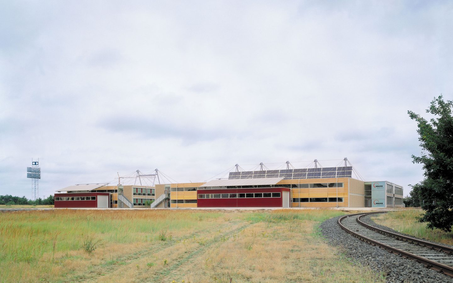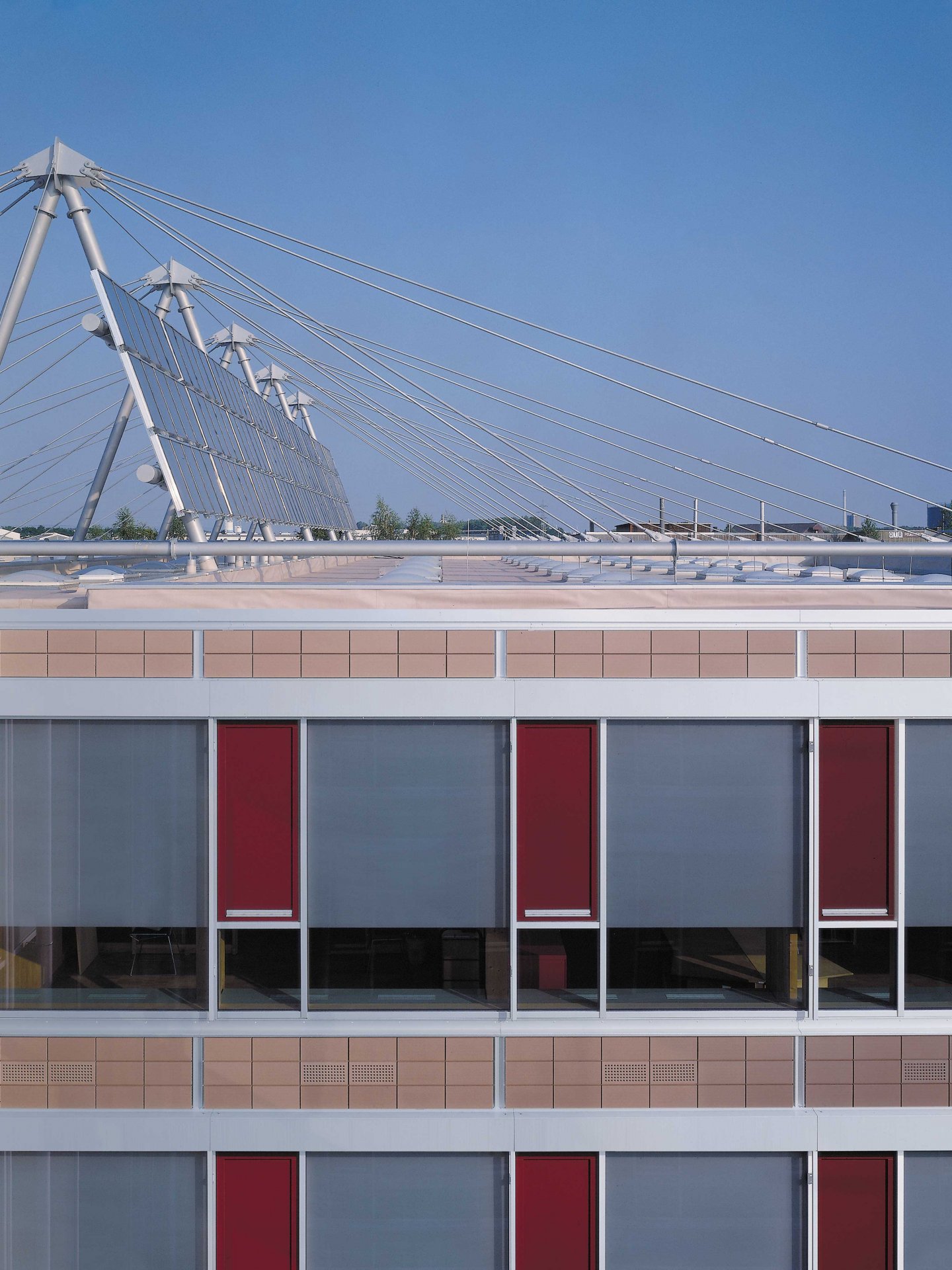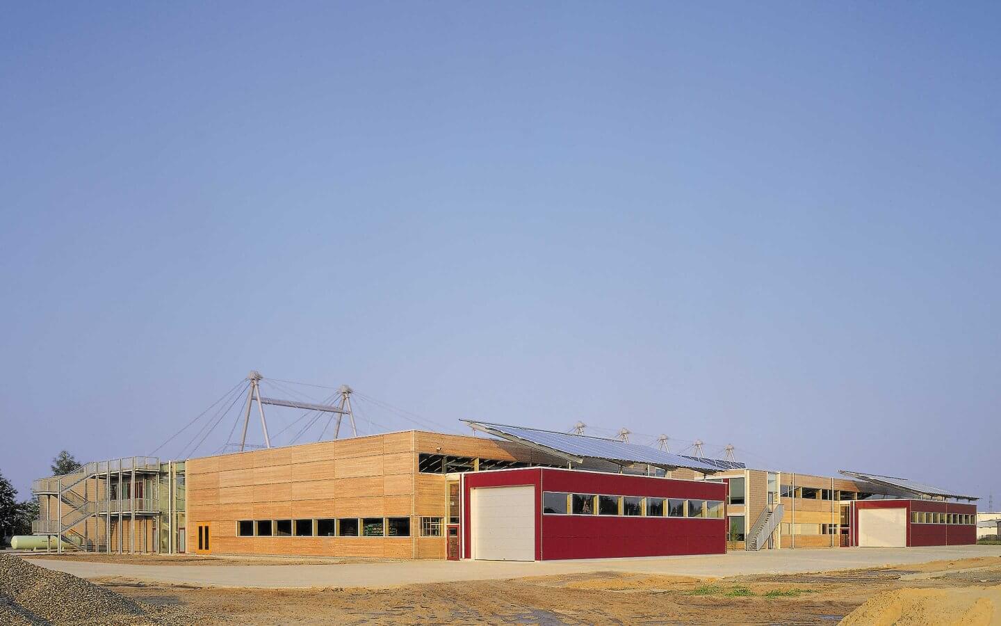 Hochwärmegedämmte Holzleichtbauteile für Wände und Dach, in die Produktionshalle integrierte Beladezonen für LKWs sowie die kompakte Kubatur des Gebäudes führten zu einem niedrigen Heizenergiebedarf von nur 27 KWh/qma. Da vor Ort weder Wasser- noch Windkraft verfügbar waren, sahen die Planer zusätzlich zu den gebäudeintegrierten Solarsystemen ein Rapsöl-Blockheizkraftwerk vor, das den Strom für die eigenen Montageanlagen erzeugt und die Abwärme zur Beheizung nutzt. Die Kombination aus der Netzeinspeisung von Überschüssen aus der Photovoltaikanlage und der Eigenstromproduktion des BHKW ergibt in der Summe auch bei konventioneller Rapsölproduktion eine CO2-neutrale Bilanz. Banz + Riecks entschieden sich, zusammen mit der Fraunhofer-Gesellschaft für solare Energiesysteme, geschlossene Vakuumpaneele in die Öffnungsflügel zu integrieren. Die Architekten zielten damit auf eine bessere Wahrnehmbarkeit und damit einen bewussteren Umgang mit der freien Lüftung. Aufgrund der Einbausituation könnten die Vakuumpaneele im Falle des Versagens einfach ersetzt werden, doch hat deren Leistungsfähigkeit bis dato nicht nachgelassen.