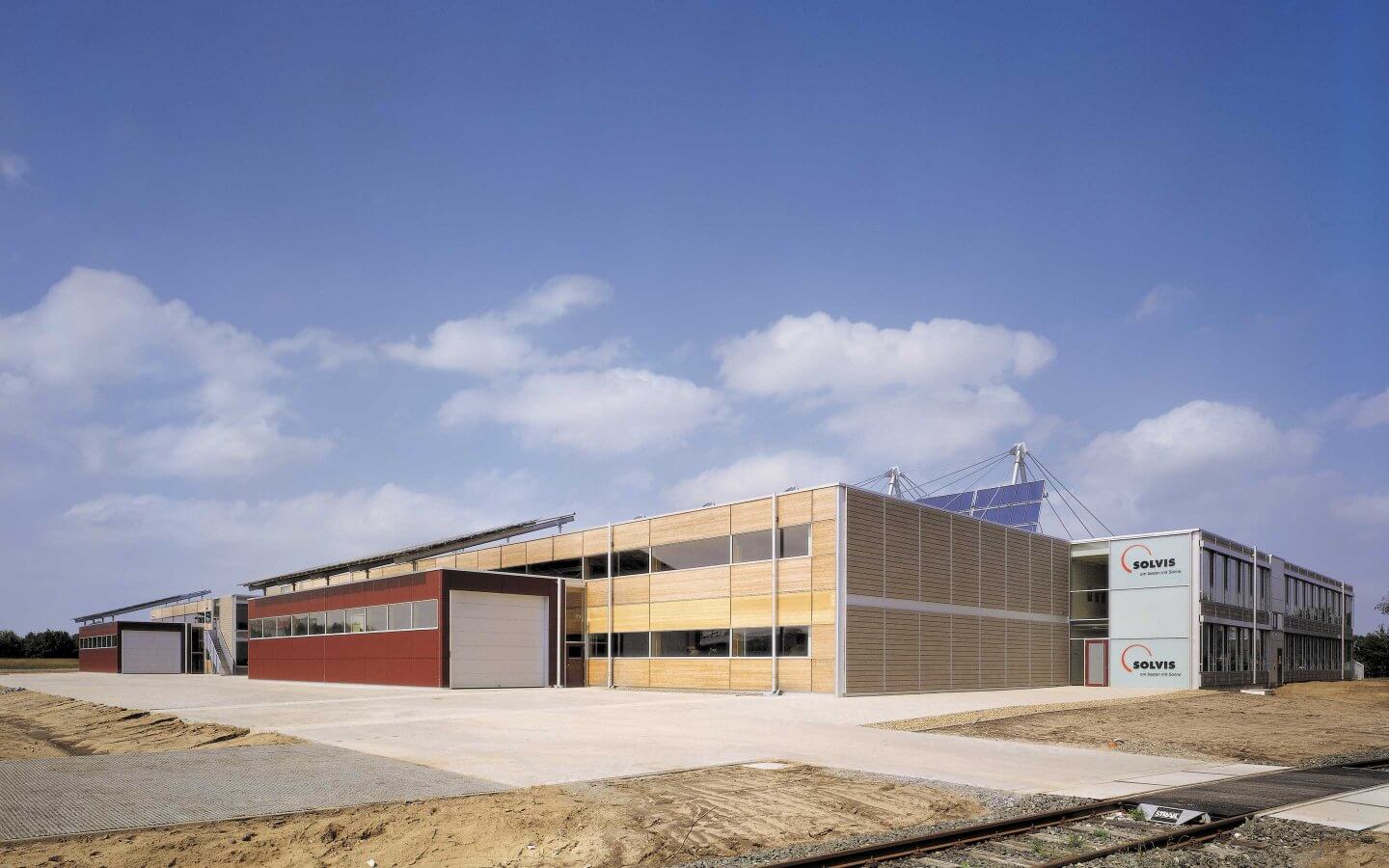Solvis, Hersteller von Solaranlagen, nutzt die erste Nullemissionsfabrik Europas nicht nur für Produktion und Verwaltung, sondern ebenso als Imageträger. Empfohlen von der Fraunhofer Gesellschaft für solare Energiesysteme überzeugten Banz + Riecks als seinerzeit einziges Büro mit der Erfahrung sowohl in energieoptimierten Verwaltungs- als auch Industriebauten aus Holz. In einem integralen Planungsprozess entstand bereits 2002 ein Büro- und Produktionsgebäude ohne Emission von Treibhausgasen.