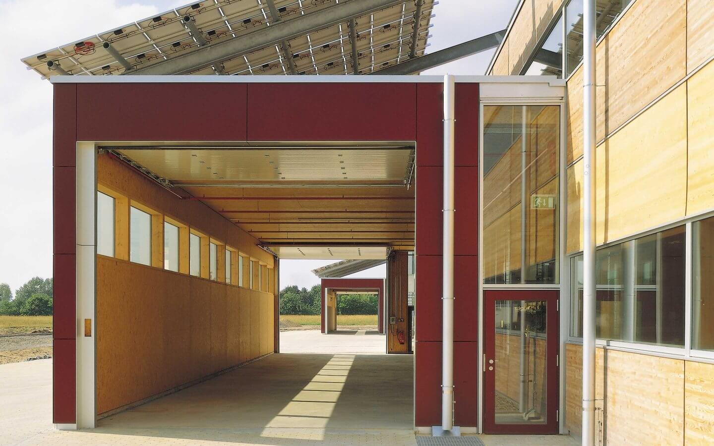 Hochwärmegedämmte Holzleichtbauteile für Wände und Dach, in die Produktionshalle integrierte Beladezonen für LKWs sowie die kompakte Kubatur des Gebäudes führten zu einem niedrigen Heizenergiebedarf von nur 27 KWh/qma. Da vor Ort weder Wasser- noch Windkraft verfügbar waren, sahen die Planer zusätzlich zu den gebäudeintegrierten Solarsystemen ein Rapsöl-Blockheizkraftwerk vor, das den Strom für die eigenen Montageanlagen erzeugt und die Abwärme zur Beheizung nutzt. Die Kombination aus der Netzeinspeisung von Überschüssen aus der Photovoltaikanlage und der Eigenstromproduktion des BHKW ergibt in der Summe auch bei konventioneller Rapsölproduktion eine CO2-neutrale Bilanz. Banz + Riecks entschieden sich, zusammen mit der Fraunhofer-Gesellschaft für solare Energiesysteme, geschlossene Vakuumpaneele in die Öffnungsflügel zu integrieren. Die Architekten zielten damit auf eine bessere Wahrnehmbarkeit und damit einen bewussteren Umgang mit der freien Lüftung. Aufgrund der Einbausituation könnten die Vakuumpaneele im Falle des Versagens einfach ersetzt werden, doch hat deren Leistungsfähigkeit bis dato nicht nachgelassen.