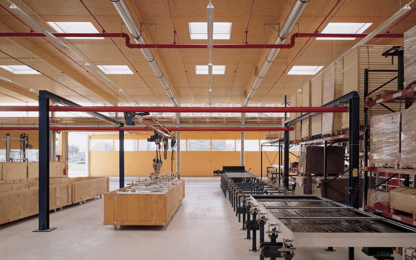 der Hersteller der betrieblichen Selbstverwaltung, entsprechend wurden sämtliche Mitarbeiter von Anfang in den Entwurfsprozess einbezogen. Gemeinsam mit den Architekten und Fachplanern erarbeiteten sie in einer wöchentlich stattfindenden „happy hour“ die notwendigen Eckpunkte der Planung. Ziel war es, trotz des extrem knappen Budgets ein gestalterisch ansprechendes, technisch ambitioniertes und in der täglichen Nutzung leistungsfähiges Bauwerk zu schaffen. Das Ergebnis manifestiert sich in einem einfachen, kompakten Gebäude, mit reduzierten Lüftungs- und Wärmelasten, jedoch ohne Abstriche an ein behagliches Arbeitsplatzklima inklusive passiver Kühlung im Sommer. Ein weiterer entwurfsbestimmender Aspekt war die Fertigungsoptimierung und Logistik sowie die gewünschte kurze Verbindung zwischen „Kopf und Hand“ im Betrieb, zwischen Verwaltung und Produktion.