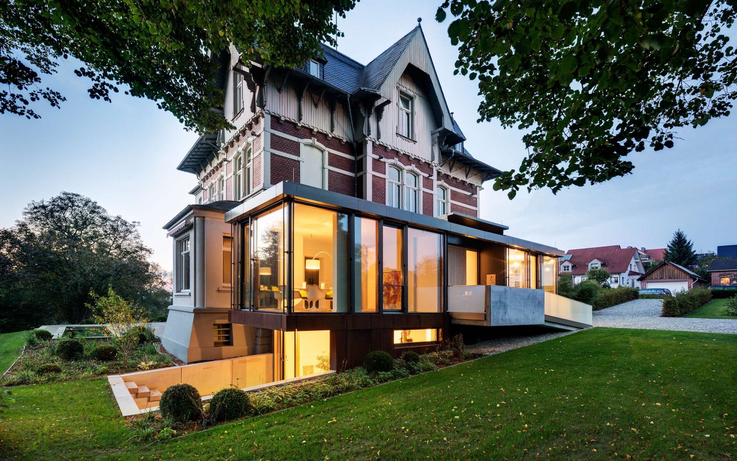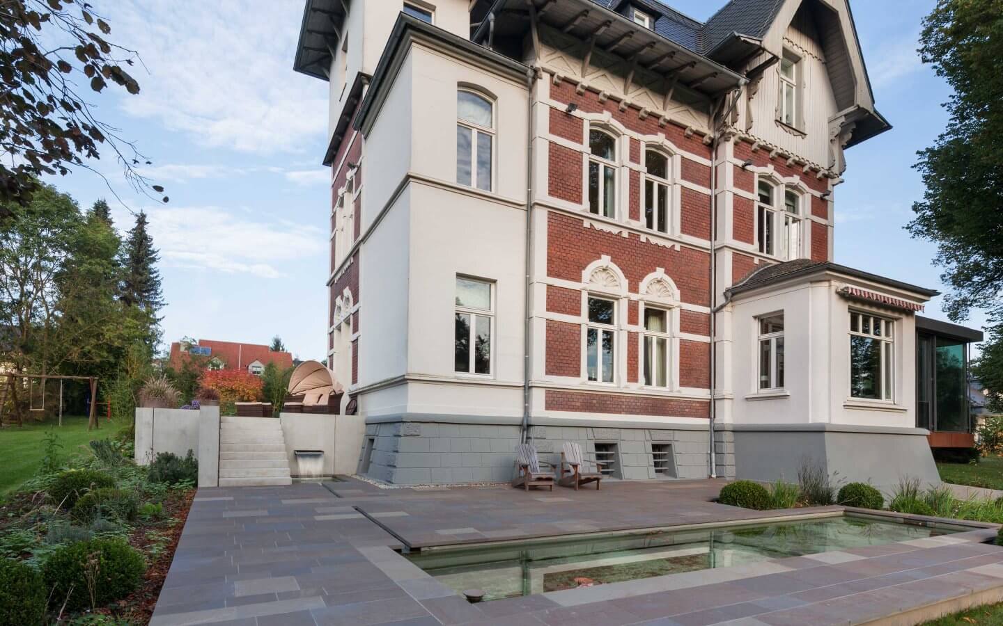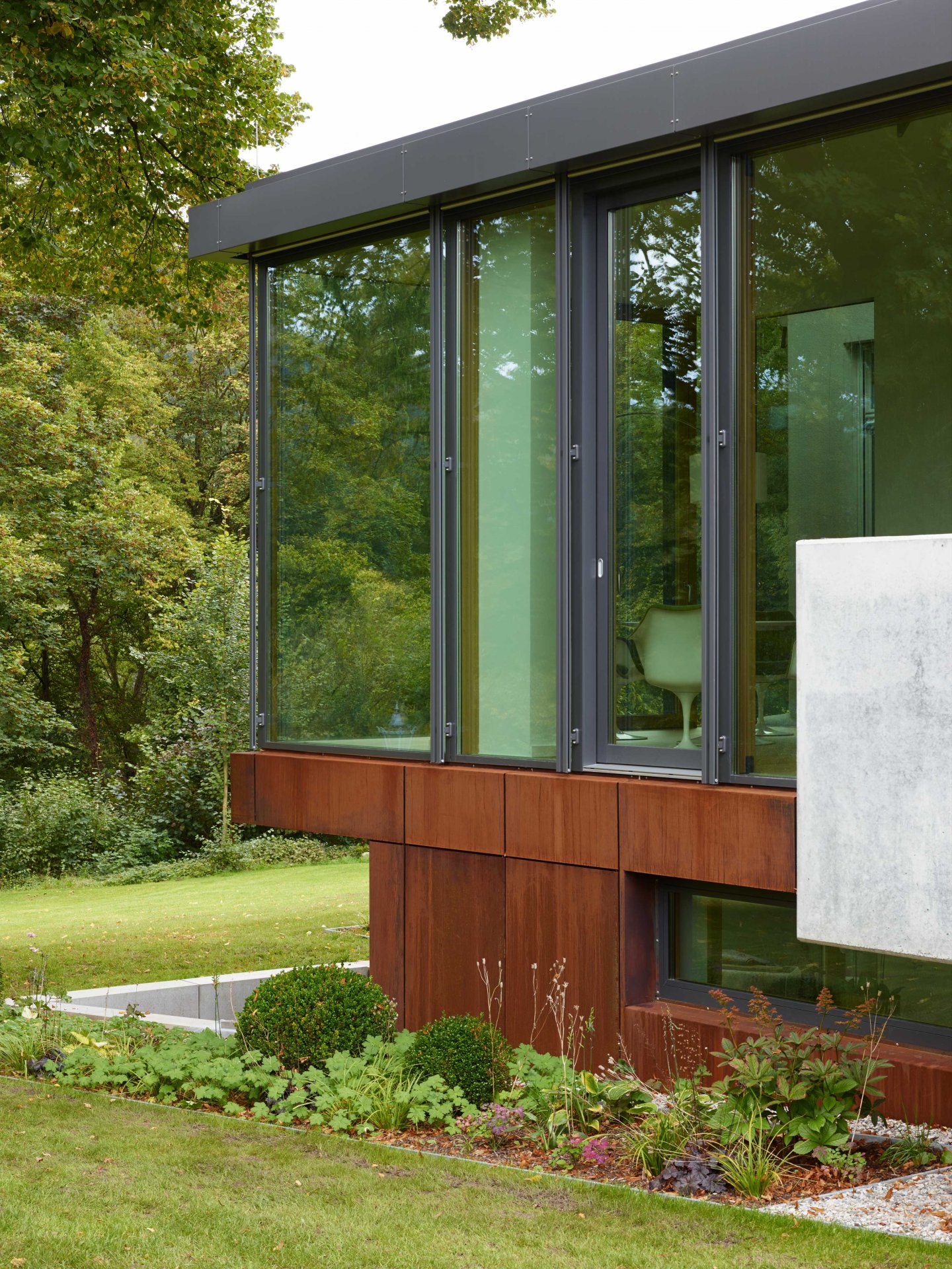 Als erstes eigenes Projekt sanierten Banz + Riecks 1996 das Haus an der Kronenstrase in Arnsberg Müschede. Ursprünglich gebaut am Anfang des zwanzigsten Jahrhunderts gab es weder Terrassen noch räumliche Bezüge ins Frei, in den Garten, in den Park. Die Realisierung des bereits 1996 konzipierten neuen Hauptzugangs, des sich in den Park öffnenden Wintergartens, sowie der ebenerdigen Ausgangsmöglichkeiten in die neu gestalteten Freianlagen, wurde 2014 fertiggestellt. Die Planung der Freianlagen erfolgte gemeinsam mit wbp Landschaftsarchitekten Bochum. Glas, Holz und corteen Stahl, als Bekleidung der geschlossenen Wandbauteile, geben dem modernen, lichten Anbau seine Korrespodenz zum bestehenden Klinkergebäude, altern mit Patina, erreichen das Zusammengehen von alt und neu.